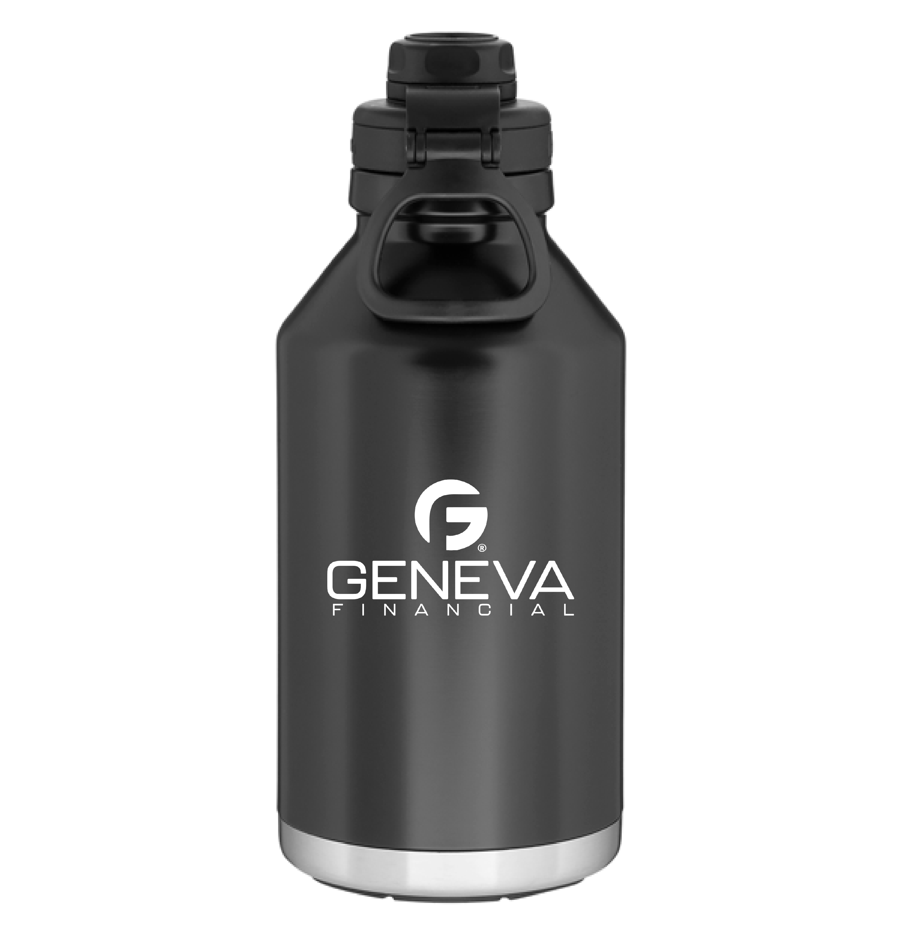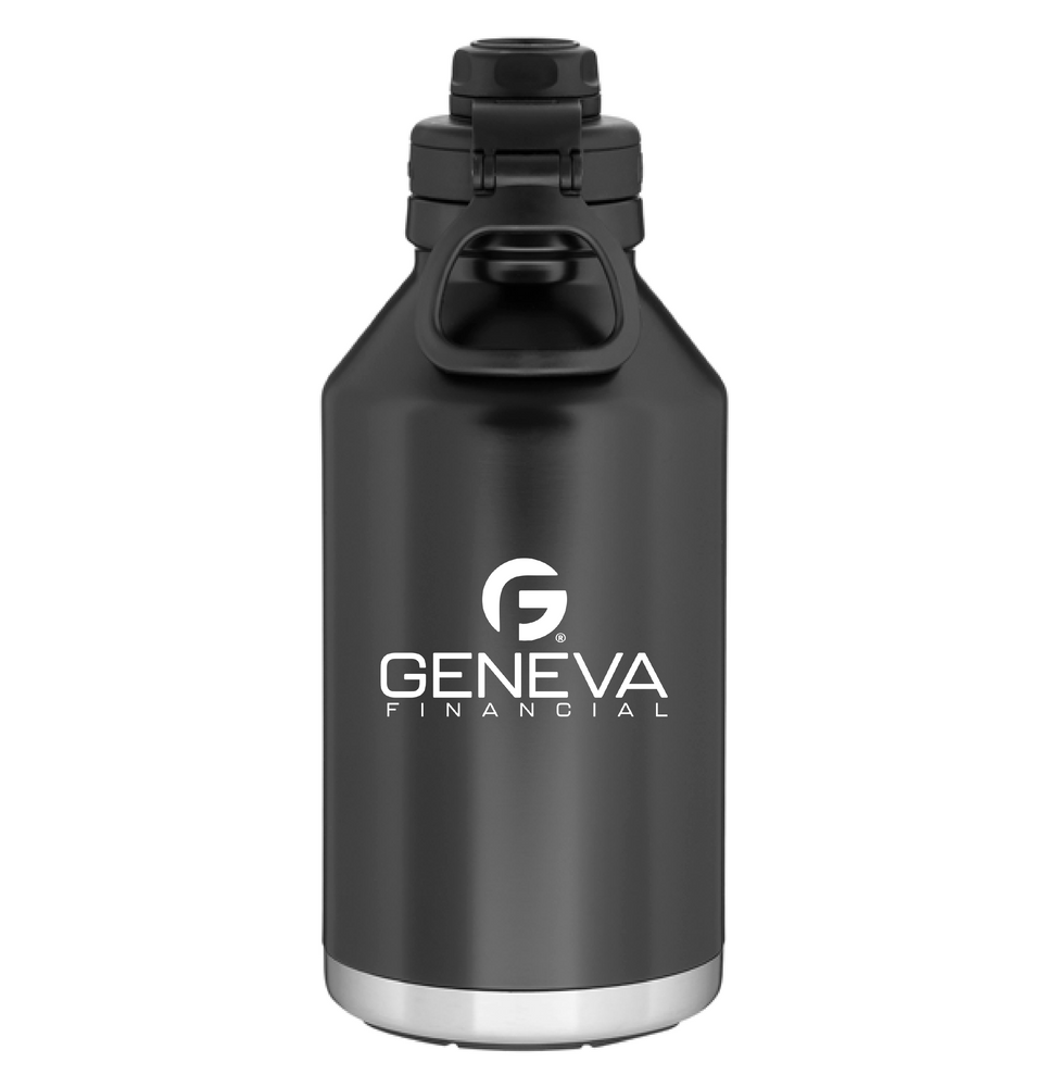 sku: GFS-20664 oz double wall stainless steel thermal growler with vacuum insulation, threaded dual-opening lid, wide drinking spout, hinged cap, carrying handle, stainless steel base, and silicone base pad.